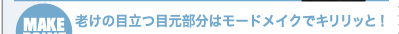 キリッと目尻部分を上げることで、顔全体のパーツが上がったように見えるため、若い印象になります。目元にダーク系の色を使用したモードメイクは、老け顔防止策としてもGOOD。まぶた全体のグラデーションを十字にさせるのがコツです。 |
