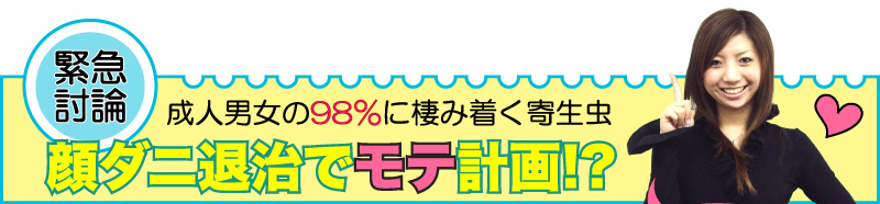 Aサン:なに・・ダニ?! B君:なんだよ、その顔ダニって・・・ Cサン:なんか聞いたことあるような。 D君:まじ?! 中嶋記者:みんな知らないの! 成人男女98%にいる寄生虫なんだよ。 E君:げっ、寄生虫?! Aサン:本当にいるの? D君:98%なんてありえないでしょ〜。 B君:いないと信じたい・・・。 中嶋記者:それが現実にいるんだって! しかも毛穴に棲み着いてるから、黒ずみの原因にもなっているんだよ。 Cサン:えぇ! あれって顔ダニのせいなの? 中嶋記者:そう、私たちが寝ている間に毛穴から出てきて、顔を徘徊するんだけど、そのときにメイクの残りや顔の汚れを身体につけたまま毛穴に戻っていくの。だから、どんどん黒ずんでいくんだよ。しかも、顔ダニは、毛穴の中で死ぬから、死骸も毛穴の中に・・・