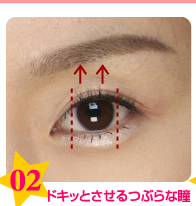 目を縦に大きく見せるため、マスカラは上に向かって垂直に、下まつ毛は真ん中のみ(黒目の幅が目安)しっかり塗る。アイシャドウはまつ毛のつけ根を濃く、二重まぶたのラインより少し大きめに。 |